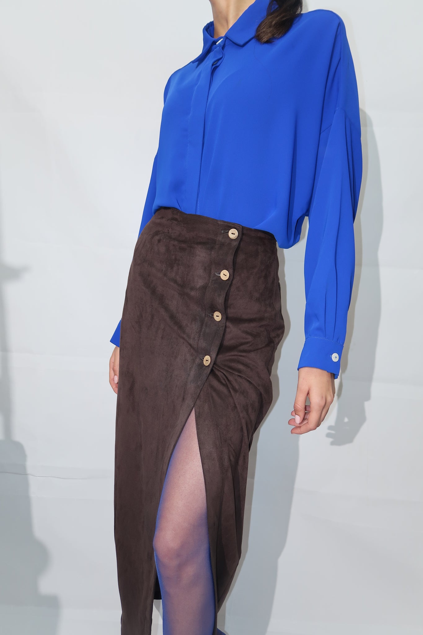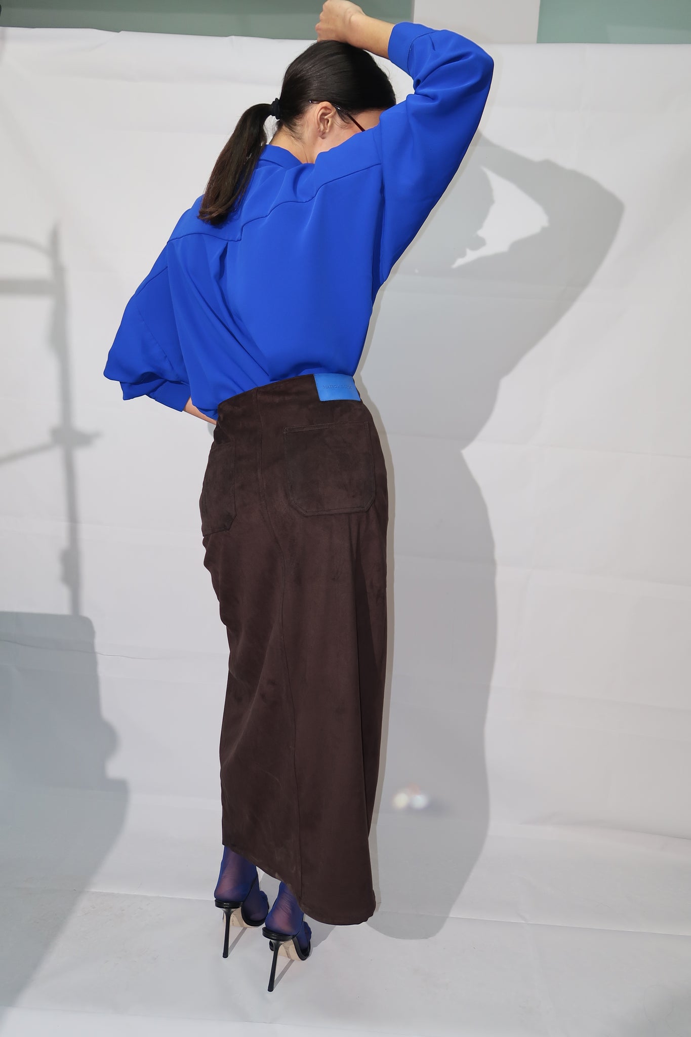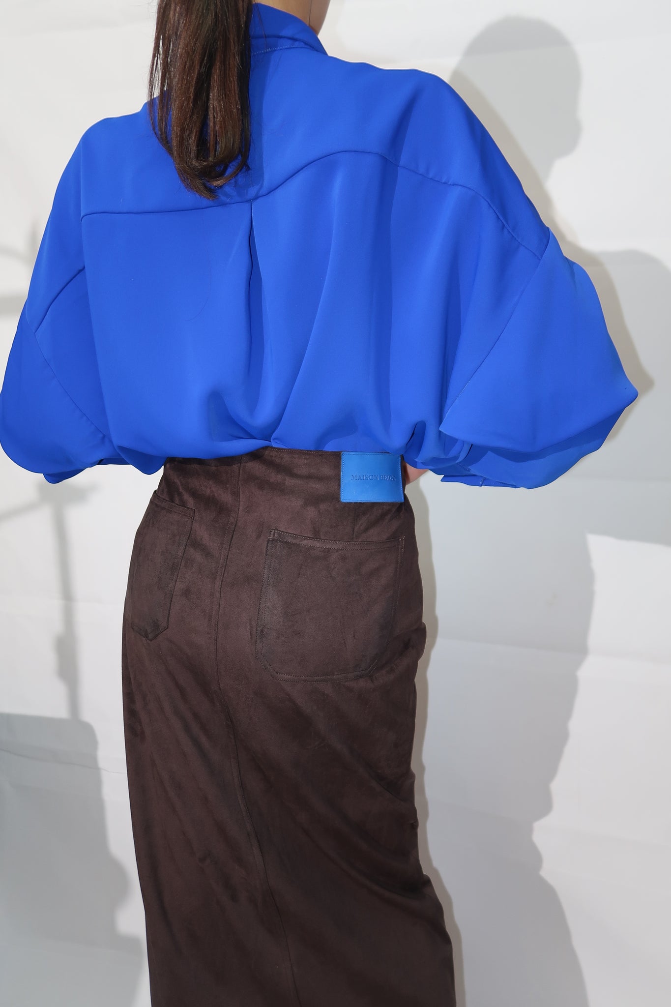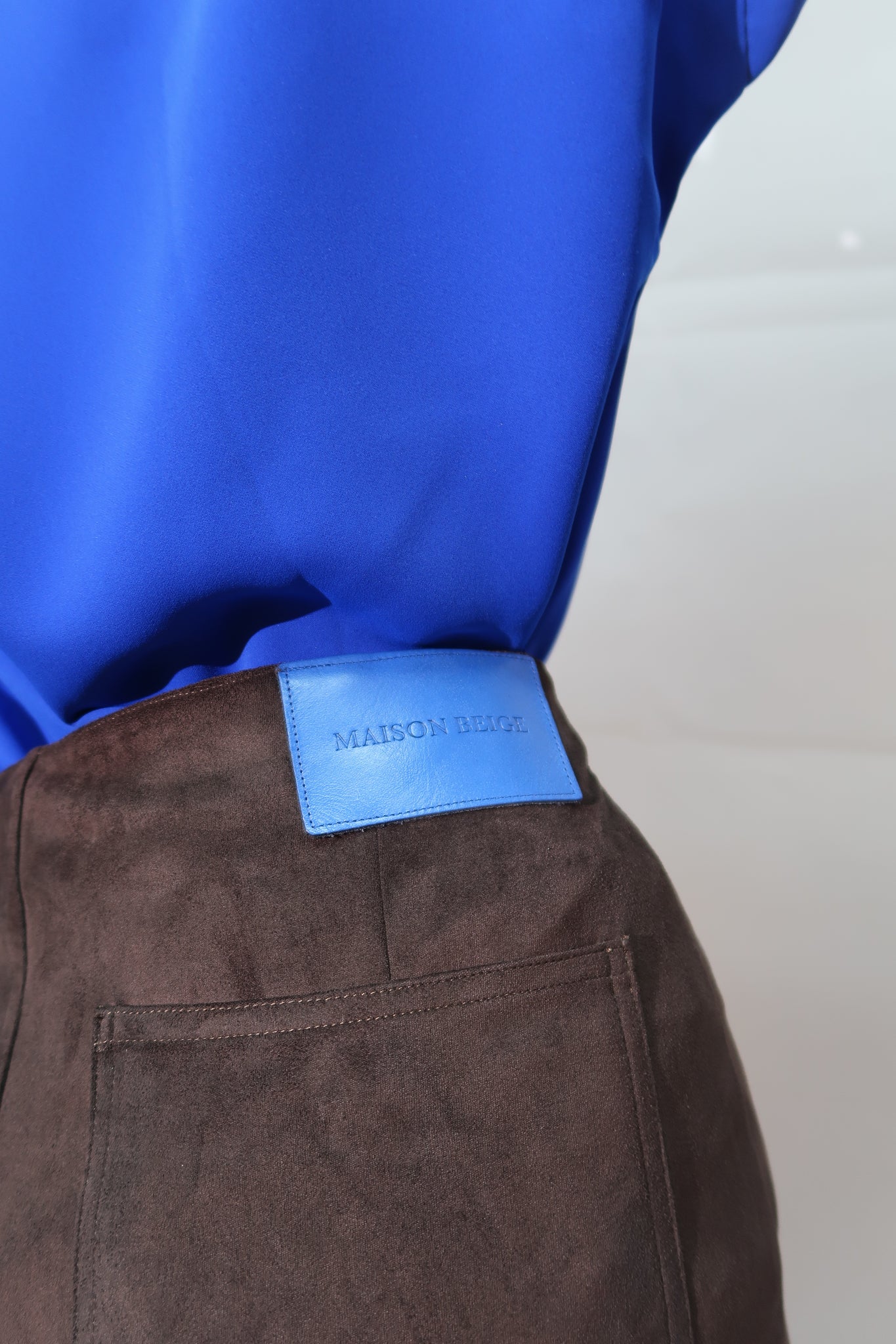 MAISON BEIGE apporte une touche de chic ultime avec la jupe maxi en suédine à la fente sur le côté. L’étiquette Jacron en cuir bleu vient contraster la couleur de la jupe .